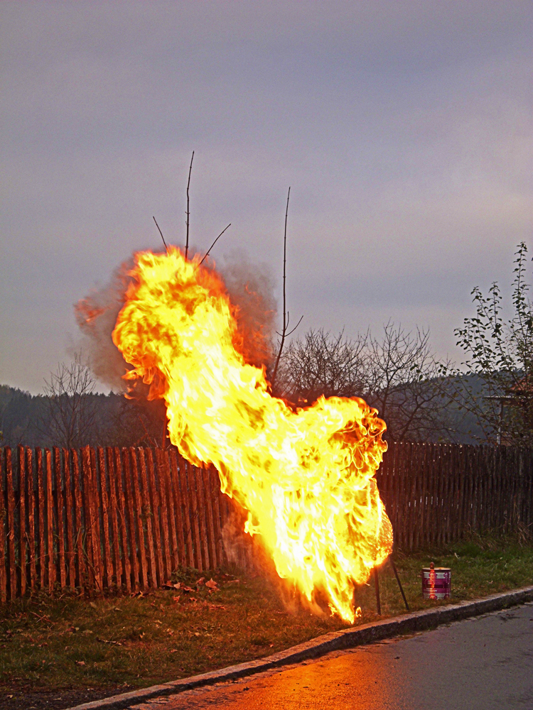 Eine Fettexplosion tritt auf, wenn fälschlicher Weise versucht wird einen Fettbrand mit Wasser zu löschen.